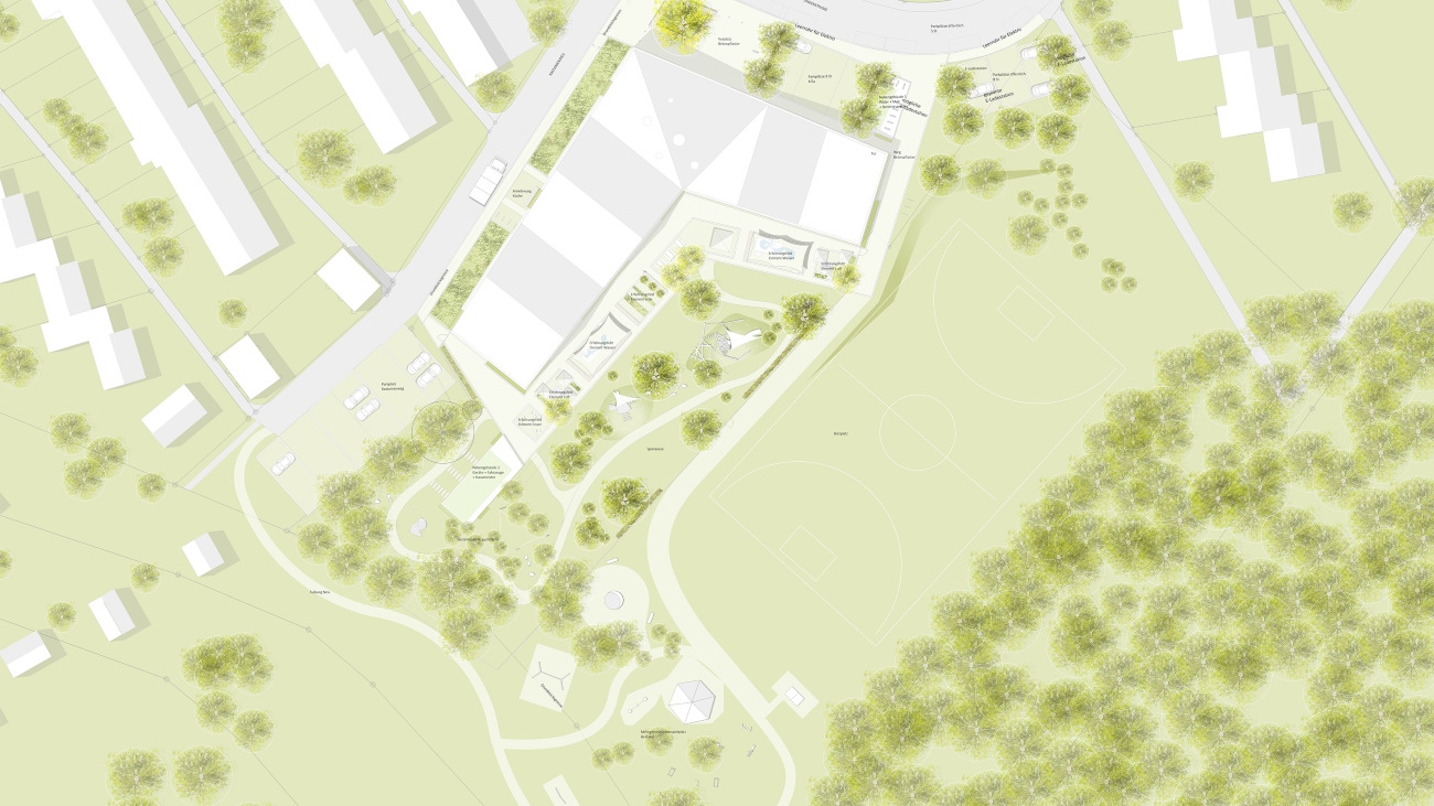 eingebettet. Der Baumüberstand gliedert die Parkbereiche, spendet Schatten und bildet einen Rahmen. Über den neuen Wirtschaftsweg wird der bestehende Mehrgenerationenspielplatz direkt angebunden. Die Andienung der Küche erfolgt über den Kastanienweg.