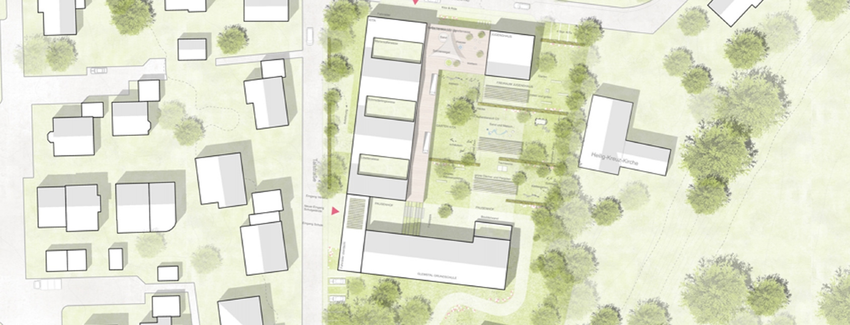 Das Herz des Kinderquartiers bildet der große Garten zwischen Jugendhaus, Tagesstätte und Schule. Er bleibt durch die locker verteilten Baumpflanzungen in die Umgebung eingebunden und als zusammenhängender Grünraum ablesbar. Niedrige Hecken gliedern den Garten für die verschiedenen Nutzergruppen. Nach Osten bleibt der Garten an den bestehenden Spielwald angebunden.