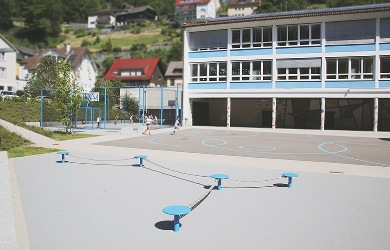 Für die verschiedenen Nutzungen werden eigenständige Räume angelegt, um ein funktionierendes Nebeneinander im Ganztagesbetrieb zu ermöglichen. Dazu gehören der Vorplatz als Schnittstelle zur Gemeinde, der Pausenhof mit einem Wechsel aus Spiel und Aufenthaltsbereichen, der Vorplatz am Seiteneingang der Sporthalle, der Hof für das Jugendzentrum sowie das grüne Klassenzimmer für den Unterricht im Freien. Dabei sind die befestigten Platz- und Hofflächen zur aktiven Nutzung östlich des Schulgebäudes angeordnet und die ruhigen, introvertierten Räume im Westen, hin zur Landschaft.